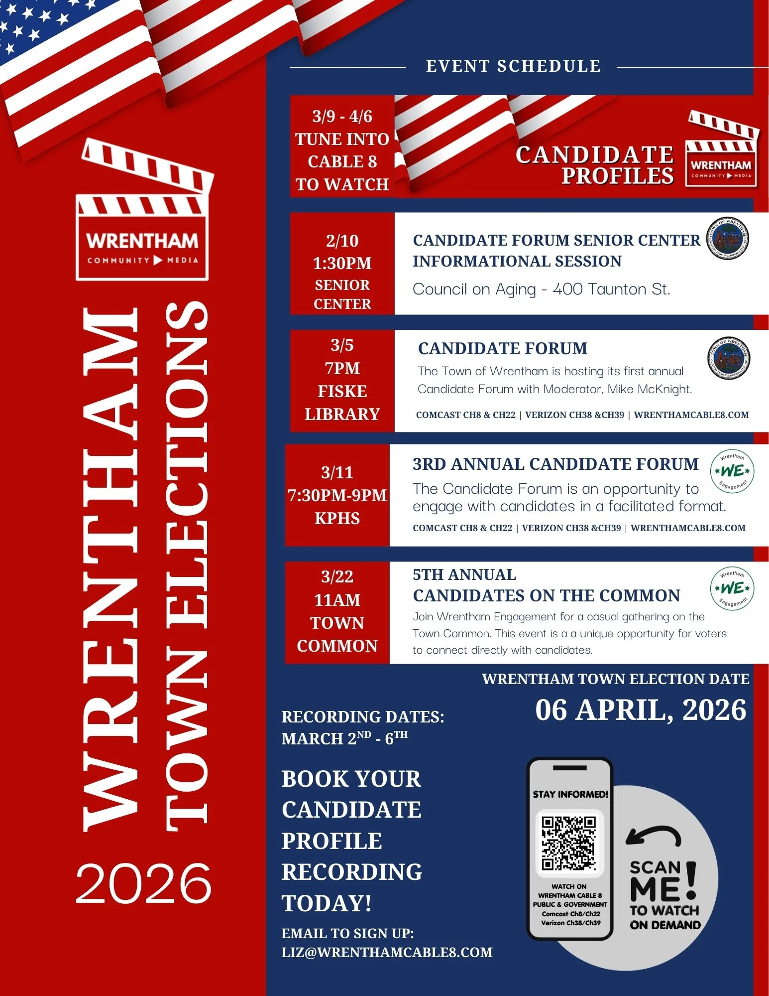 Wrentham Community Media is proud to support our local elections by offering Candidate Profile recordings for all certified candidates. These recordings provide an equal, accessible platform for you to share your background, priorities, and vision for the community in your own words.