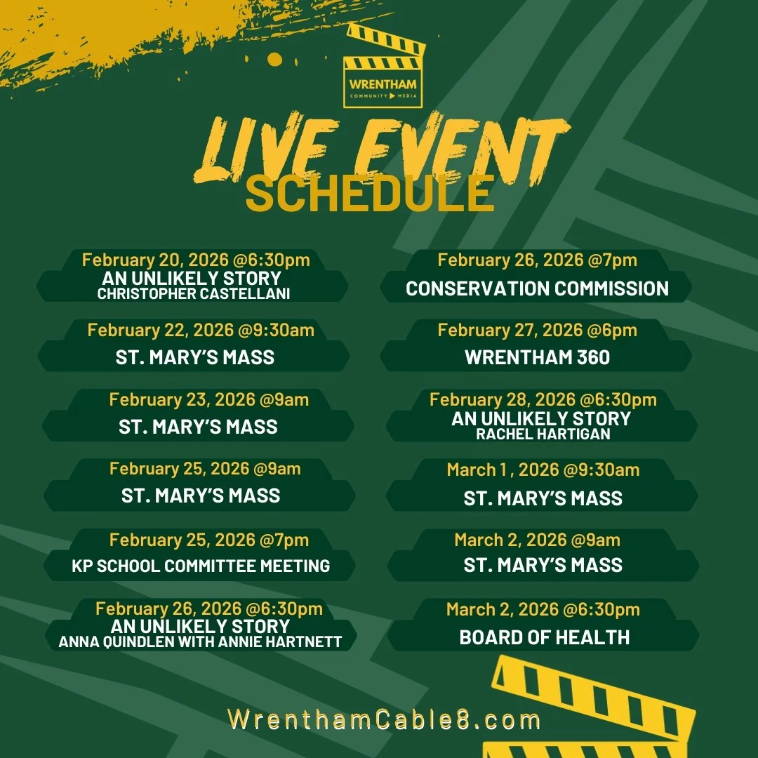 UPCOMING EVENTS UPCOMING EVENTS UPCOMING EVENTS Live on Wrentham Government Comcast Ch22 | Verizon Ch38 February 17, 2026 @6:30pmSelect Board Live on Wrentham Government Comcast Ch22 | Verizon Ch38 February 18, 2026 @7pmPlanning Board Live on Wrentham Public Comcast Ch8 | Verizon Ch39 February 12, 2026 @6:30pmAn Unlikely Story - Adele Parks with Hank Phillippi Ryan Live on Wrentham Education Comcast Ch6 | Verizon Ch37 February 13, 2026 @6:30pmBoys Basketball vs. Attleboro